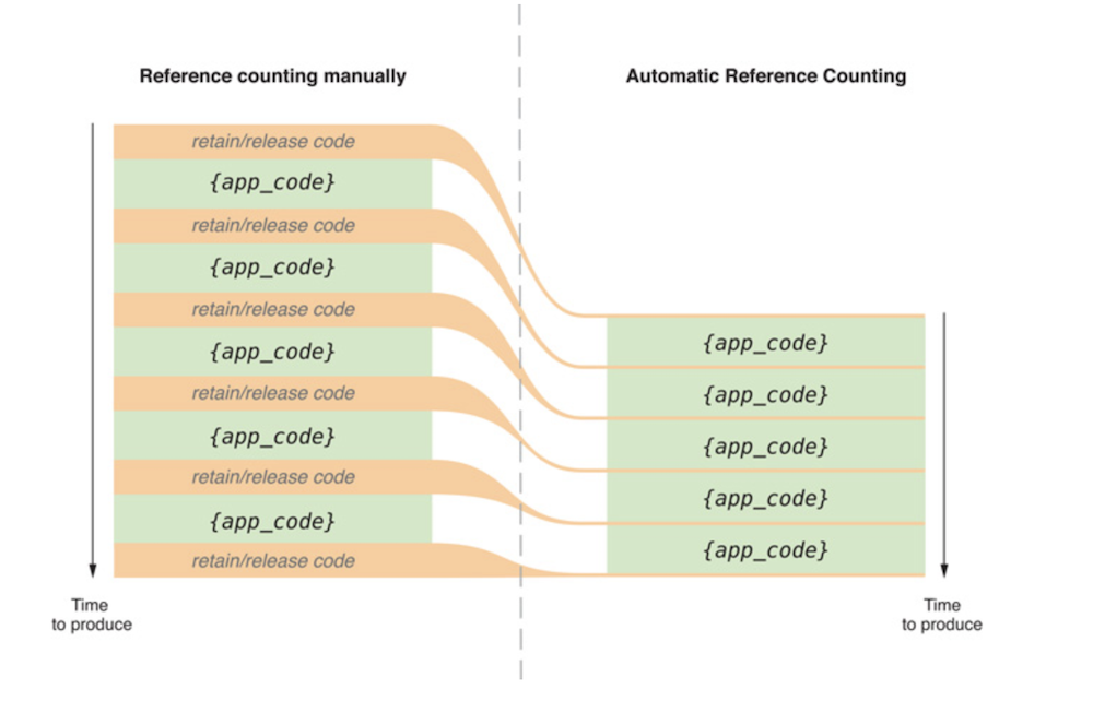 ARC는 Automatic Reference Counting의 약자입니다. 컴파일러가 알아서 메모리 관리 코드를 삽입해 줍니다. 코드의 양은 적어지고 프로그램의 안정성을 높일 수 있게되었습니다. ARC가 등장하면서 부터 거의 모든 프로젝트는 ARC를 사용한다고 봐도 무방합니다.